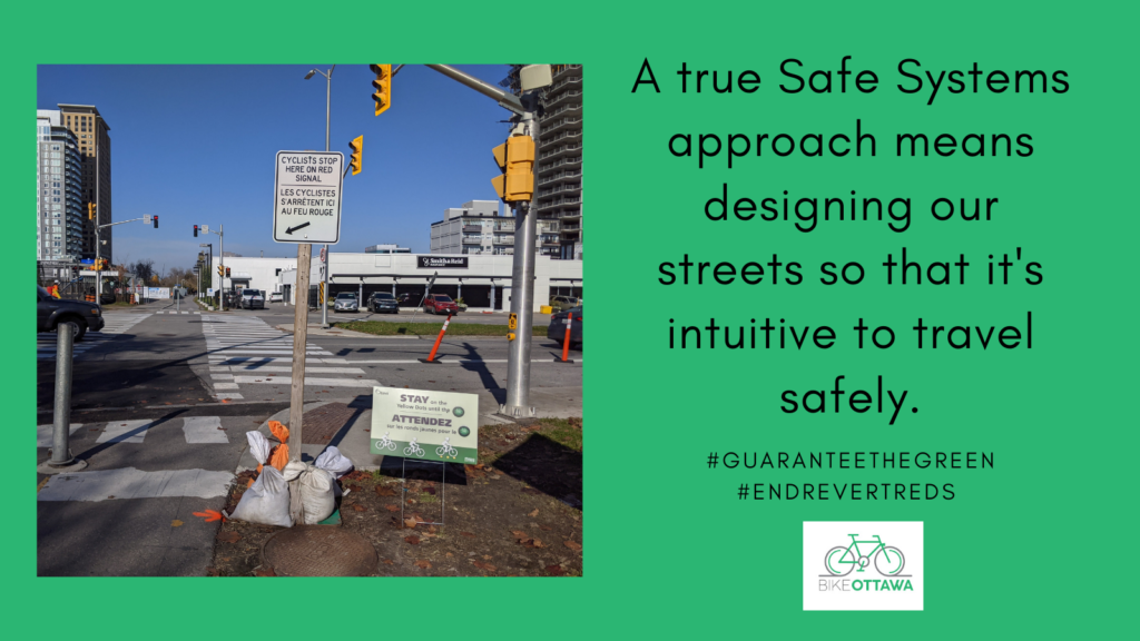 As the Road Safety Action Plan adopted by City Council in 2020 notes, “there is recognition that a human error on the roadway should not lead to death or serious injury, and that road traffic systems must be designed accordingly.” By eliminating red reverts, Ottawa can show leadership in making streets safer, by implementing this safe systems approach. Not only will this improve safety, it will contribute to making our streets liveable. This is key to encouraging the development of 15-minute neighbourhoods as envisioned by the new Official Plan by making biking a more attractive mode of travel.
