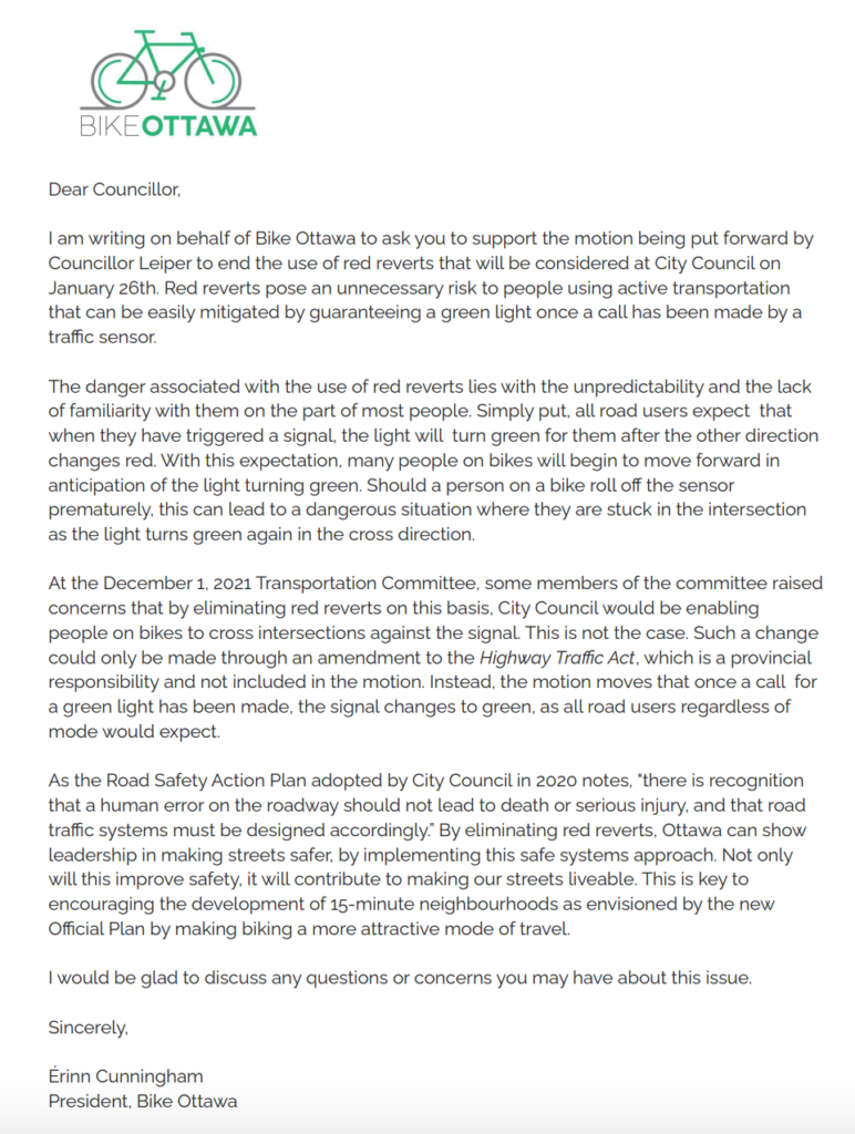 I am writing on behalf of Bike Ottawa to ask you to support the motion being put forward by Councillor Leiper to end the use of red reverts that will be considered at City Council on January 26th. Red reverts pose an unnecessary risk to people using active transportation that can be easily mitigated by guaranteeing a green light once a call has been made by a traffic sensor.
