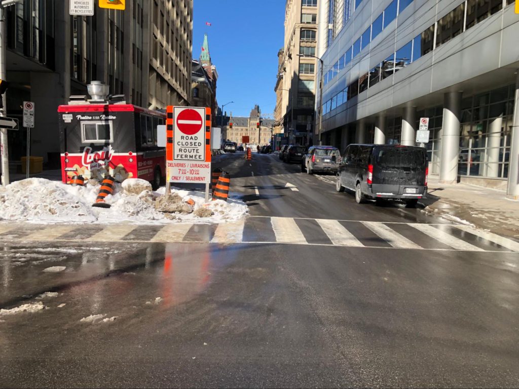 While there certainly are businesses along Sparks Street—one street to the south—they can still access Wellington by vehicle. (There’s signage that permits deliveries from 7 to 10 am [see image below], but anyone who’s gone through knows there’s a vehicle or two on there most hours of the day.) Note also that Wellington isn’t a truck route, and so it isn’t like returning it to cars would change the situation for deliveries by truck.